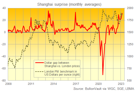 但是,随着本月以美元计算的全球金价大幅上涨,同时以许多其他主要货币计算的金价也创造了新的历史高点,以人民币计算的上海金价上涨得更快,周一达到了每克446日元的历史新高,使整个三月的上海金价比上个月的平均水平高出12%,为新的金条进口提供了每盎司30美元以上的溢价。
